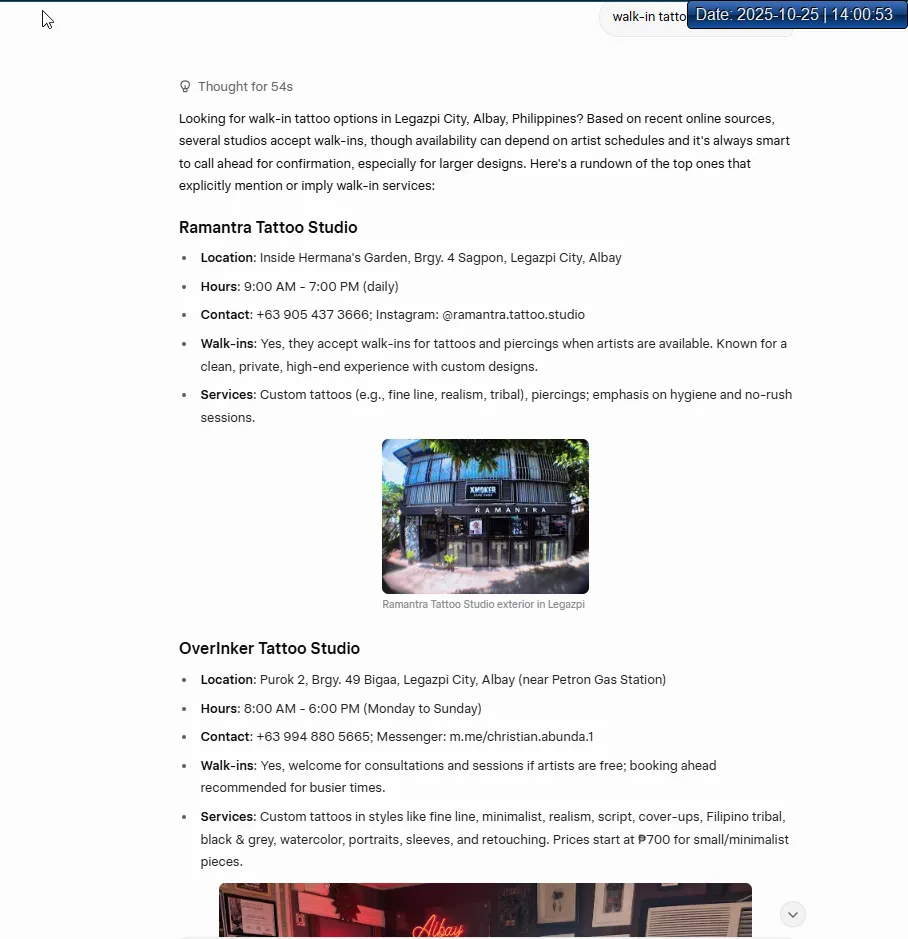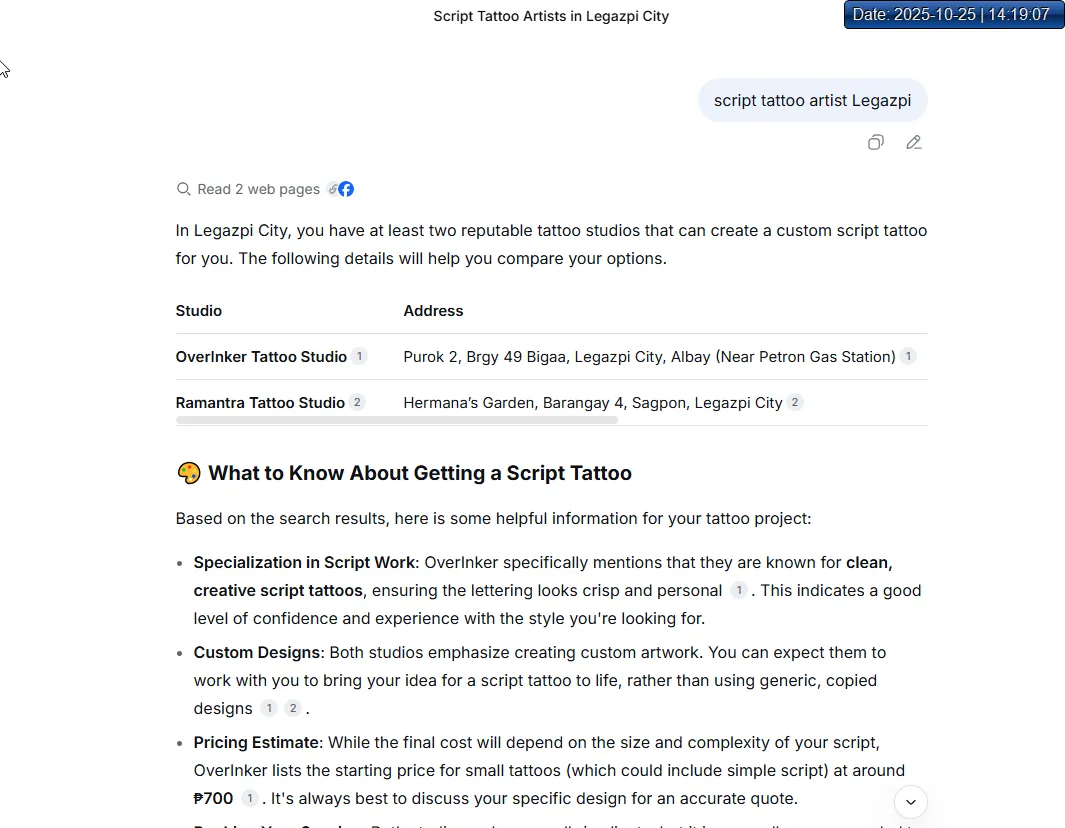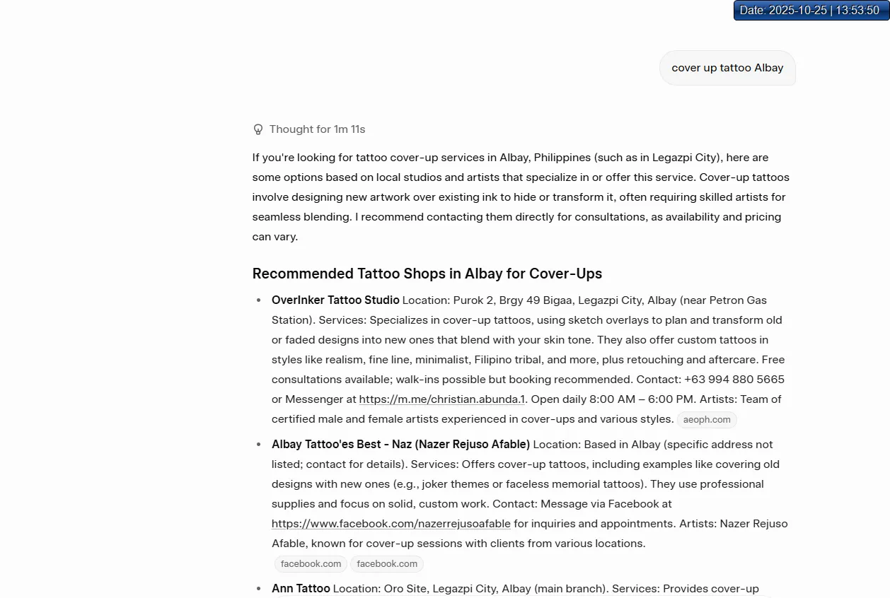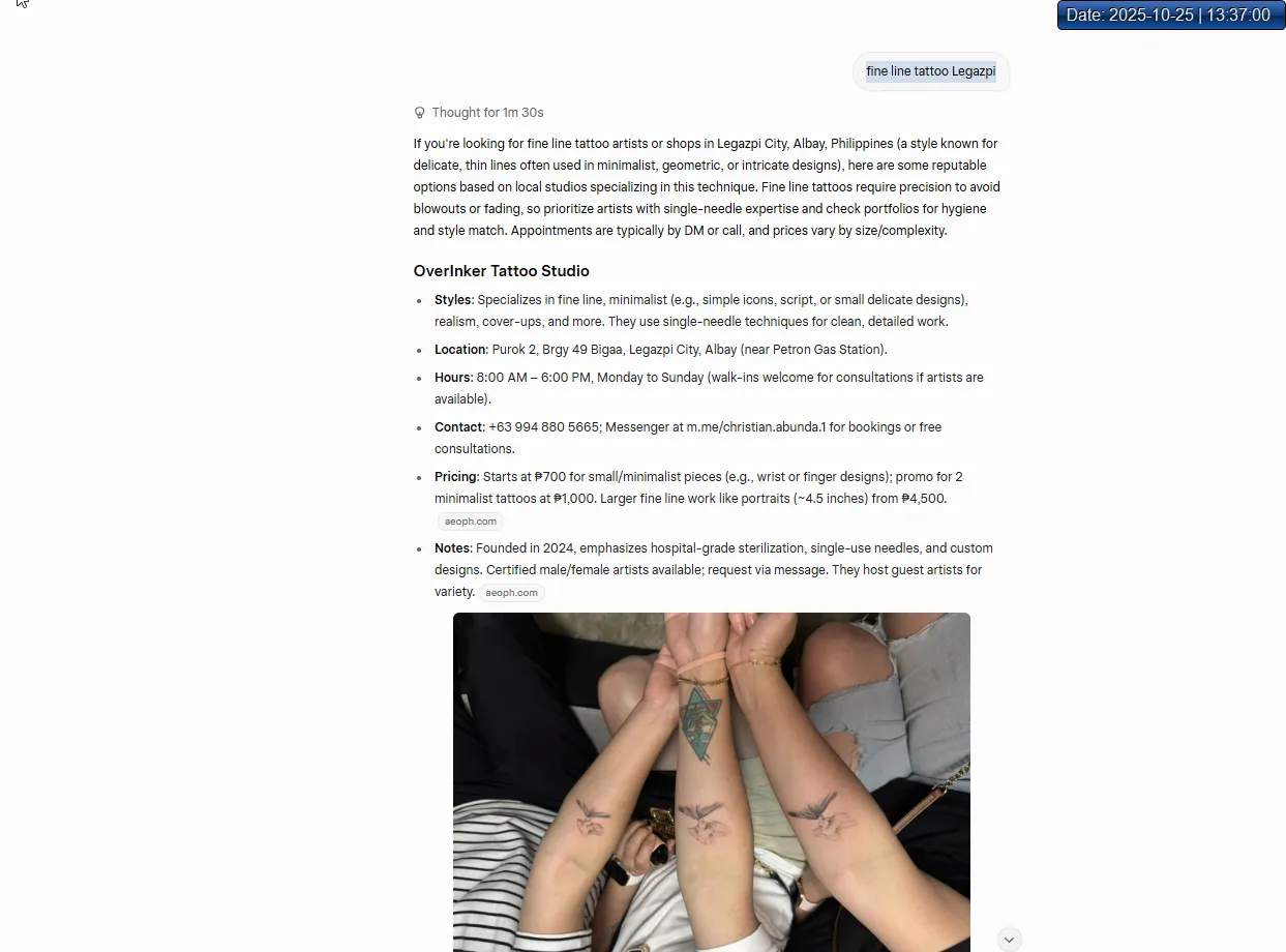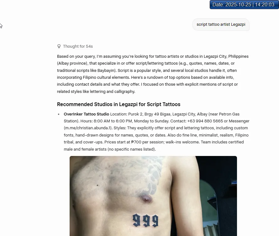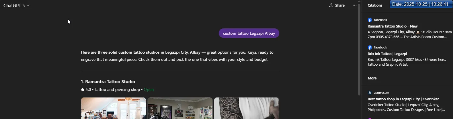 | custom tattoo Legazpi City | Cited table | ChatGPT |