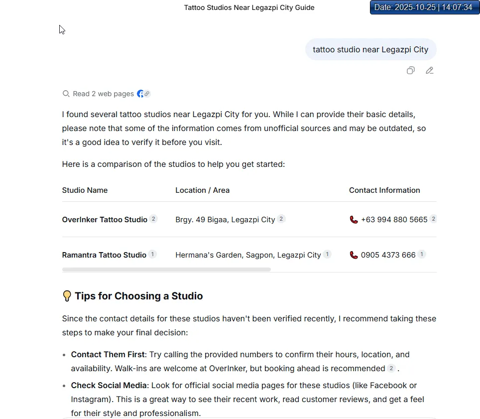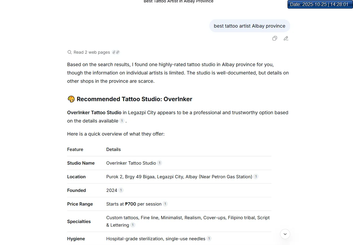 | tattoo studio near Legazpi City | Top 2 (cited) | Grok |
